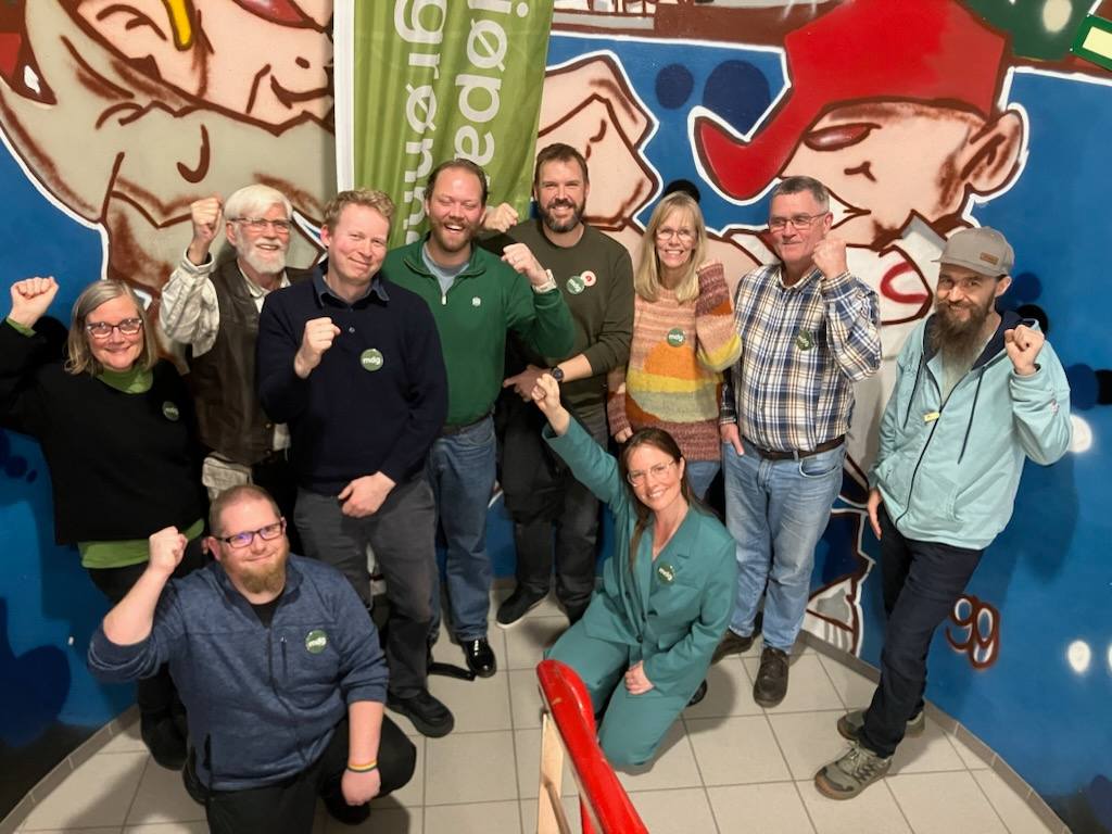 På bildet ser vi at møtedeltakerne feirer det nye laget. Noen er fra Modum, noen er fra Øvre Eiker, og noen er fra fylkesstyret. Foran ser vi Catrin Janøy på kne. Hun sitter i kommunestyret i Drammen. Hun holdt en fin inspirerende tale.